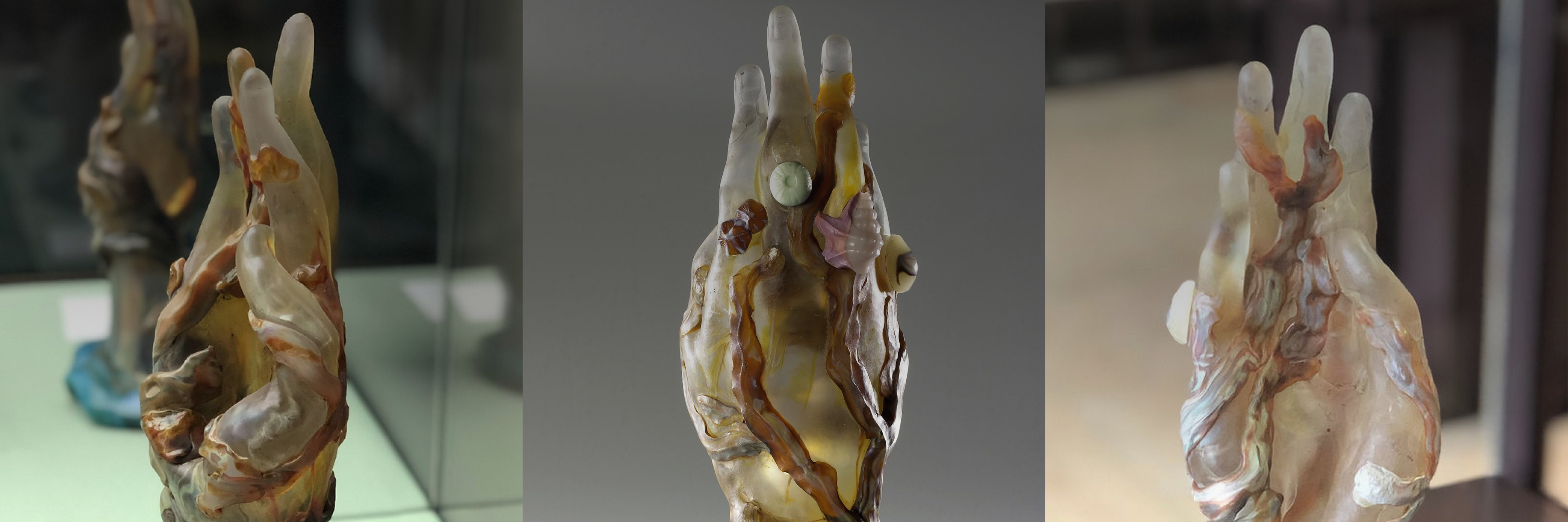 En 1904, Émile Gallé présente une étrange sculpture de cristal à l’exposition des Arts décoratifs de Nancy : une main droite déformée, aux doigts démesurément allongés, qui surgit d’une base de cristal bleu suggérant une vague. La chair est traitée avec une couleur transparente ambrée, bien loin d’une carnation réelle....